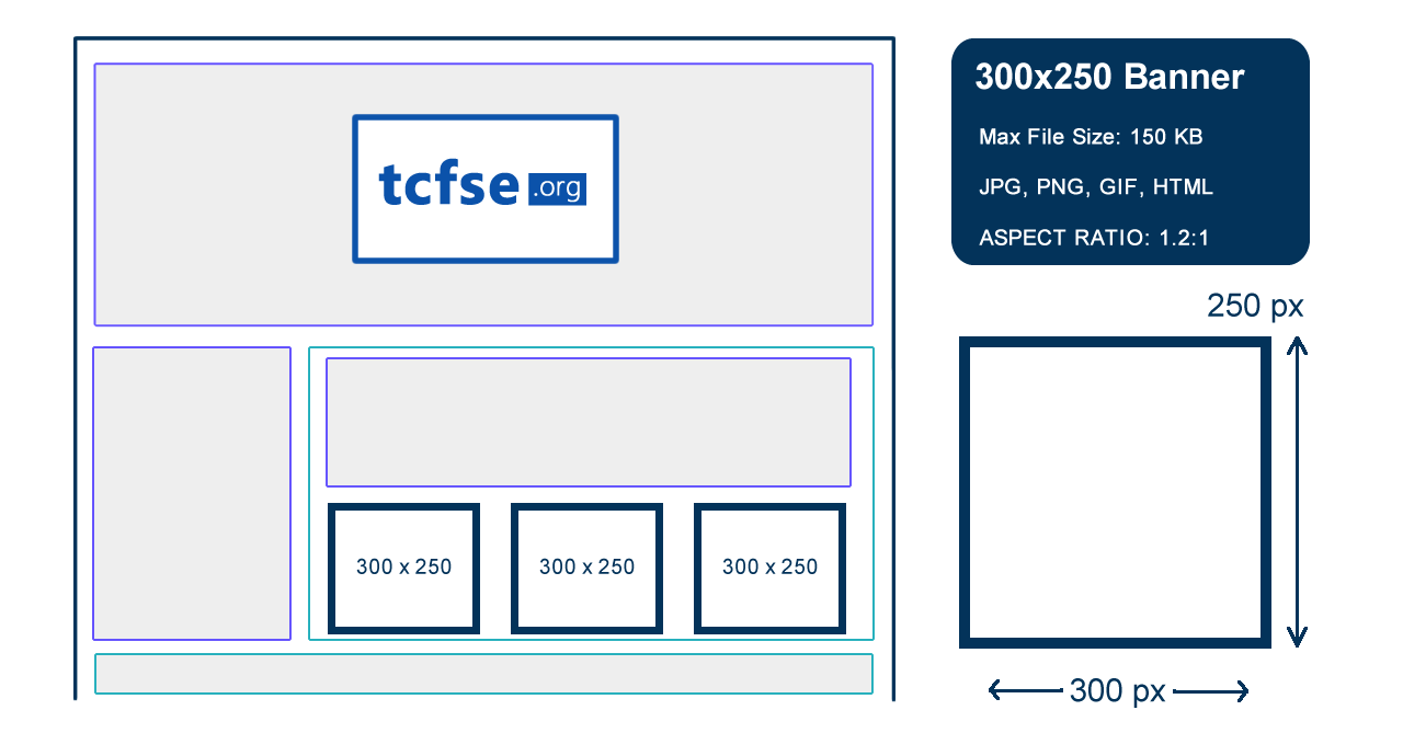 The 300x250 banner is a medium rectangle ad which can be placed in-content to break up editorial and draw attention to related information or as an eye catching ad to promote a product or service.